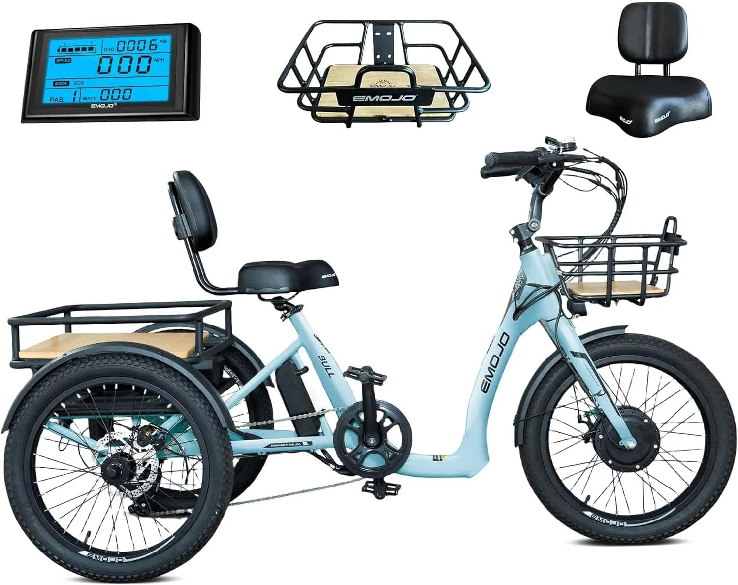EMOJO Bull 8.5″ Low Step Through Electric Tricycle for Adults Up to 100 Miles Long Range Ebike Trike with Differential 500W 7 Speed 20MPH Three Wheel Electric Bike